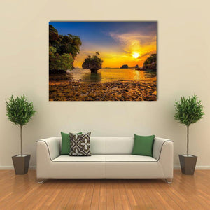This canvas art captures the serene beauty of a sunset over the ocean at Ko Hong Island. Rich hues of gold, orange, and blue reflect off the tidal flats, blending peacefully with lush green rock formations, creating a vibrant and tranquil atmosphere.