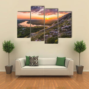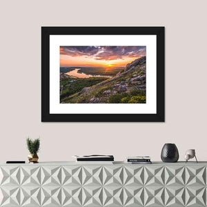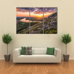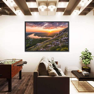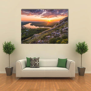 Sunset Over Rocks And River depicts a winding river through a valley beneath mountains, with clouds and forest lit by golden-hour sunset. The realistic, vibrant scene uses orange, purple, green, brown, and gray tones and composition with rule-of-thirds framing and depth to highlight a rocky foreground with grass. Its serene yet dramatic mood fits modern living rooms, offices, or nature-inspired spaces.