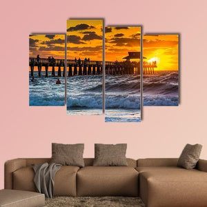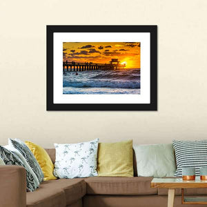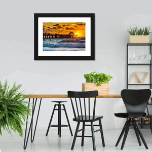 Sunset Over Fishing Pier shows a fishing pier and ocean at sunset, with people on the pier and choppy waves. The realistic landscape uses warm oranges and yellows balanced by cool blues and browns to create a serene, peaceful mood. It suits coastal or modern rooms looking for calm, nature-focused wall decor.
