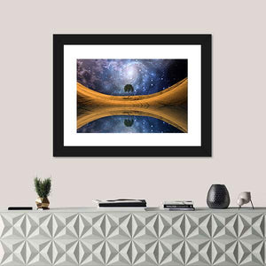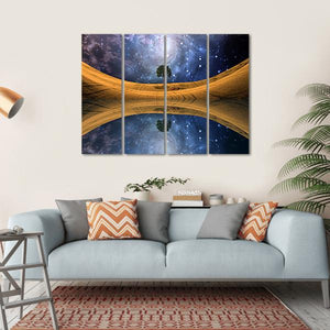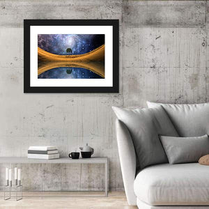 This artwork captures a serene lake scene under a dreamy night sky, featuring reflections that invoke a sense of tranquility. With its rich palette of blue, gold, and black, it brings a surreal touch to any space.