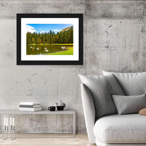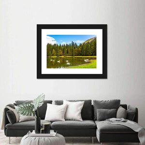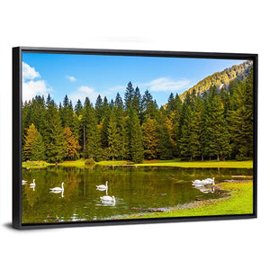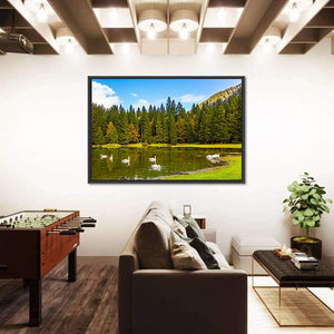Swans In Lake In Northern Italy shows a flock of swans gliding across a calm lake beneath an autumn-toned forest and distant mountains. Rendered realistically in greens, blues, browns and white, the scene feels peaceful and serene and suits living room or bedroom decor with a nature-minded or modern look.