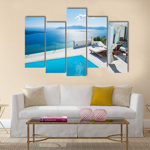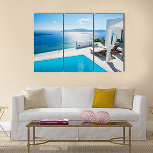 This canvas wall art captures a serene ocean view featuring a sparkling swimming pool, lounge chairs, and a white pergola. Its modern design and relaxing color palette of blue and turquoise create a luxurious atmosphere, perfect for brightening up any space.