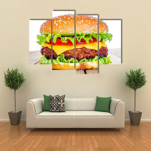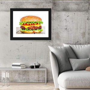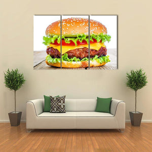 This canvas print features a centered, realistic cheeseburger—sesame seed bun, lettuce, tomato, cheese and a beef patty—rendered in a warm palette of brown, green, yellow and red. Its appetizing, true-to-life look fits kitchens, dining areas, diners or modern room decor that celebrates food.