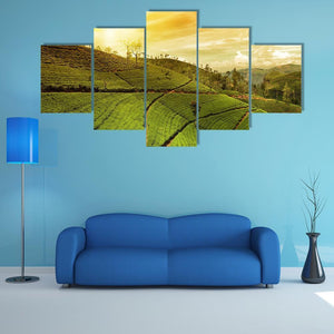 This canvas wall art captures the serene beauty of a tea plantation, featuring lush green fields and rolling hills under a vibrant sunset. Perfect for adding a peaceful touch to your living space.