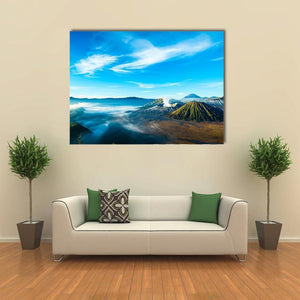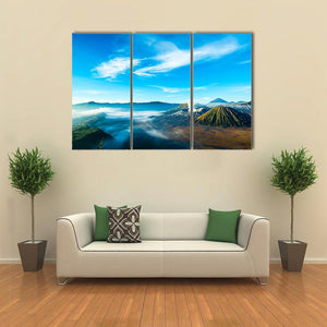 Aerial view of Mount Bromo rising through fog and wispy clouds, rendered in vibrant, photorealistic color. Wide-angle composition and leading lines guide the eye across layered mountains and volcanic smoke, creating a majestic, serene atmosphere that fits modern living rooms or entryways.