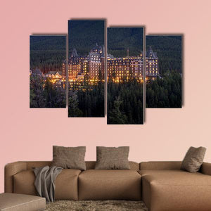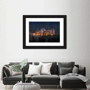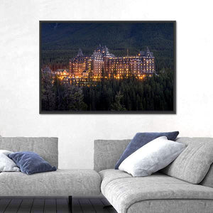 Banff Springs Hotel Canvas Wall Art depicts the hotel set against an evergreen forest and a forested mountainside. The realistic landscape captures a twilight scene with warm illuminated windows and a grand, serene mood. It suits modern or nature-inspired room decor where a calm, cinematic focal piece is wanted.