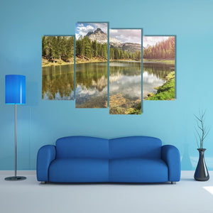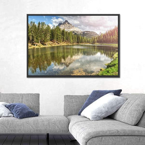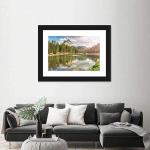A photorealistic view of a blue lake flanked by mountains and forest, with sunlight filtering through clouds and the peaks reflected in the water. Its calm green-and-blue palette creates a peaceful, natural mood that suits modern living rooms, bedrooms, or home offices.