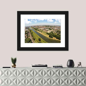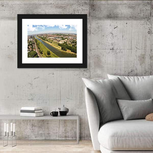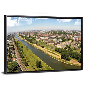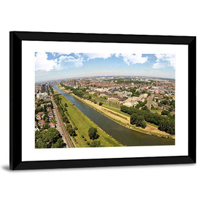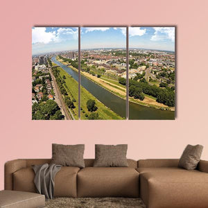 City Of Mannheim Canvas Art captures a high-angle view of the Mannheim skyline with a curved river, train tracks and a residential area in a peaceful, expansive urban scene. The photographic, realistic print uses greens, blues, brown and white to suggest a summer daytime atmosphere. It pairs well with modern living-room decor and other home spaces.