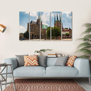 This captivating canvas artwork features the majestic Erfurt Cathedral, showcasing its stunning Gothic architecture against a serene backdrop of trees and a beautiful sky. The earthy palette of browns, greens, and blues invites a sense of calm and history into any space.