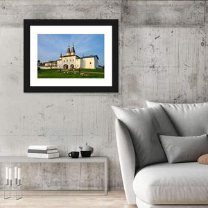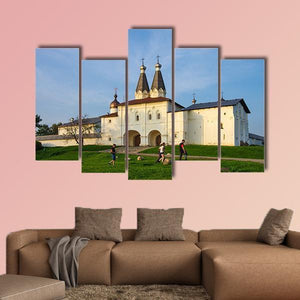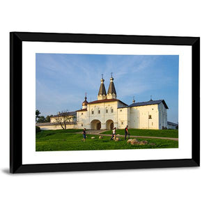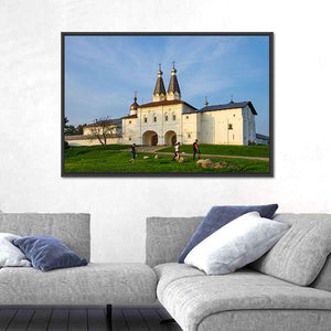 Ferapontov Convent In Summer Canvas shows a realistic summer view of a Russian monastery with twin domed towers, an arched entrance, trees and people on the lawn. The scene feels serene and sunny, using white, green, blue and brown to convey daytime calm. It suits room decor that favors quiet architectural landscapes.