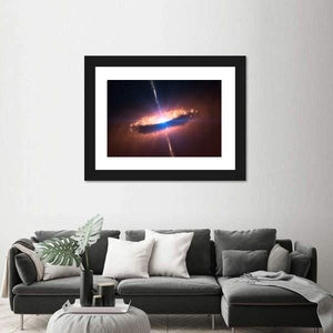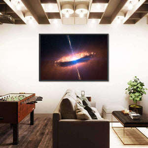 This panoramic canvas shows a galaxy and nebula with a bright optical center, an accretion disk, and a high-energy star jet. Its blue, orange, black, and purple palette and abstract sci‑fi style create a cosmic, powerful, awe-inspiring atmosphere that works well in modern or sci‑fi inspired rooms.
