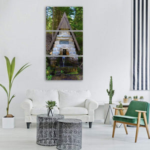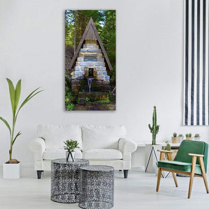 The Luznice River in the Czech Republic appears here with a stone fountain and a small waterfall tucked into a mossy forest, composed at eye level. A green, gray, brown and blue palette and rustic, naturalistic style give the scene a serene, refreshing feel that suits nature-inspired or rustic rooms.