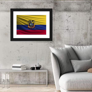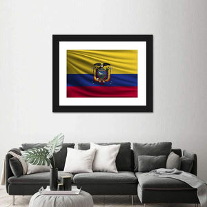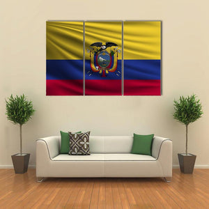 This canvas print depicts the National Flag of Ecuador with its detailed coat of arms in a realistic style. Symmetrical composition and a waving-flag texture in yellow, blue, red and gold create a patriotic, proud mood that fits modern homes, offices, or national-themed wall decor.
