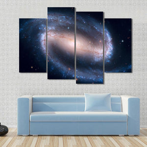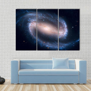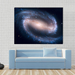 This artwork captures the awe-inspiring NGC 1300 spiral galaxy, displayed in a vast cosmic setting. With swirling arms and a bright core set against a palette of blue, pink, and black, it invites you to explore deep space.