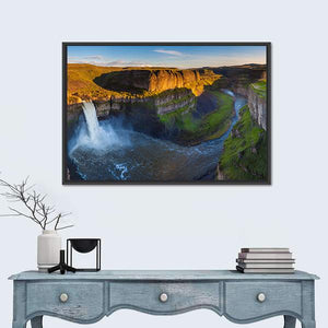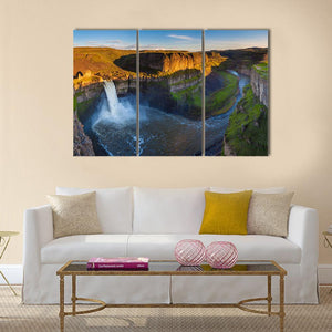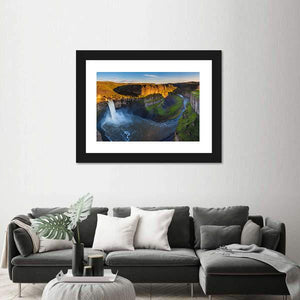 A panoramic view of Palouse Falls, Washington: a waterfall plunging into a pool with sunlight illuminating the canyon cliffs and lush green vegetation. The realistic, dramatic landscape feels majestic and serene and suits modern living rooms or nature-themed rooms.