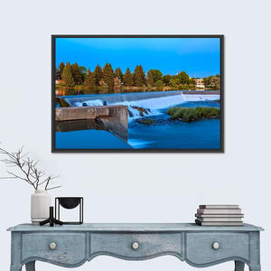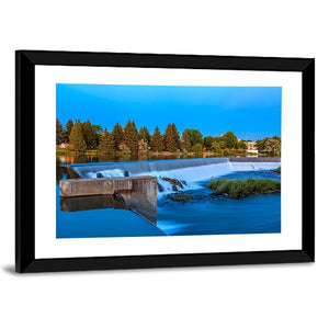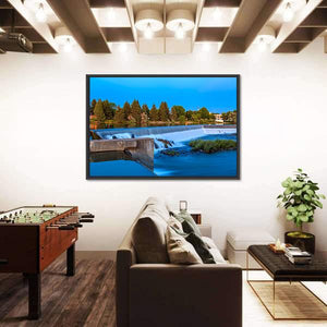 Small Waterfall On Snake River presents a realistic riverside scene with a long‑exposure effect on the falling water, trees, and a concrete structure in the foreground. Its blue and green palette gives a calm, natural mood that fits modern homes or nature‑themed rooms.