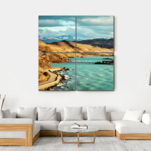 This stunning canvas captures the serene beauty of Torres del Paine in Chile, featuring a winding road that leads to a tranquil lake. With snow-capped mountains in the background and buildings along the shore, it brings a majestic touch of nature to your space.