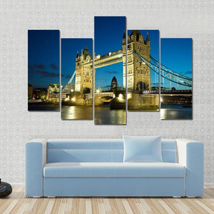 This striking canvas features Tower Bridge gracefully illuminated at dusk, offering a beautiful view over the River Thames. The vibrant blues and warm golden tones reflect an iconic London skyline, evoking a sense of grandeur and tranquility.