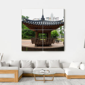 This canvas features a traditional Korean gazebo with a curved roof, nestled among lush greenery in a serene park setting. The peaceful ambiance is enhanced by earthy tones of green and brown, inviting a sense of tranquility into your space.