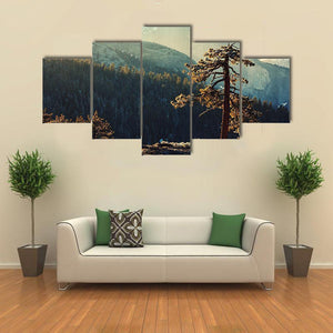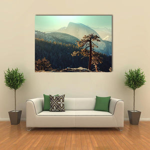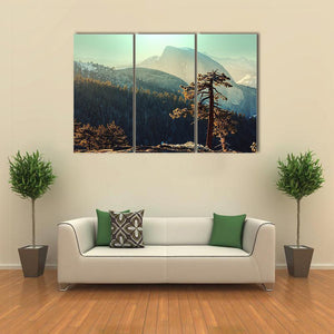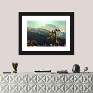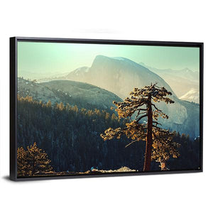 This landscape artwork captures the serene beauty of Yosemite, featuring a lone pine tree set against majestic snow-capped mountains. The misty atmosphere and natural palette of green, blue, and brown evoke a peaceful vibe, perfect for bringing a touch of nature indoors.