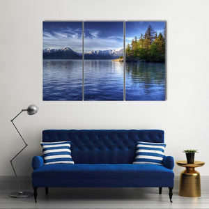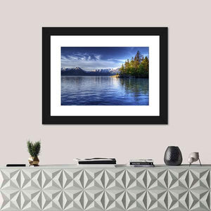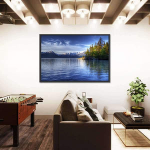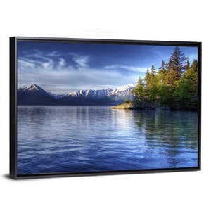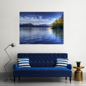 This landscape canvas art features majestic snow-capped mountains and serene reflections on a tranquil lake. The soft blues and whites combine beautifully to create a realistic portrayal of nature.
