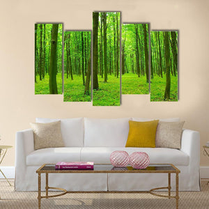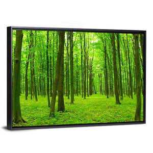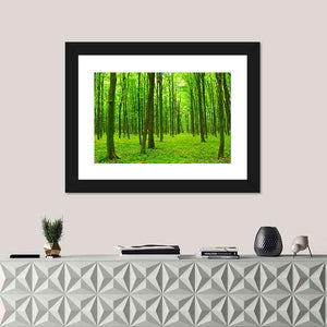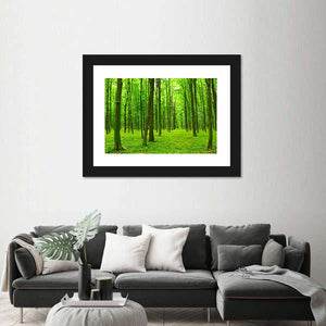 A photorealistic view of tall trees and lush green ground cover receding into the distance under spring daylight. The scene feels serene and vibrant, with greens, browns and hints of yellow that read natural and calm. Suited to modern homes or nature-focused rooms as simple, peaceful wall decor.