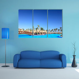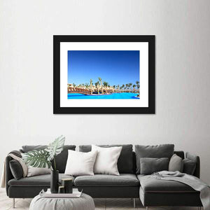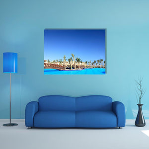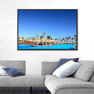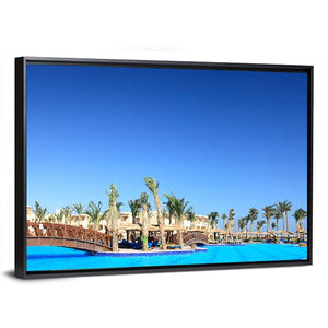 A photorealistic landscape showing a resort swimming pool in Morocco, framed by palm trees and a wooden bridge beneath a clear blue sky. The wide-angle, low-perspective composition and blue-green palette create a relaxed, tropical vacation mood. Works well in modern or beach-inspired rooms and room decor.