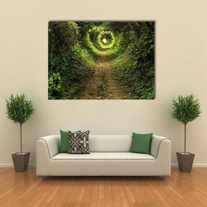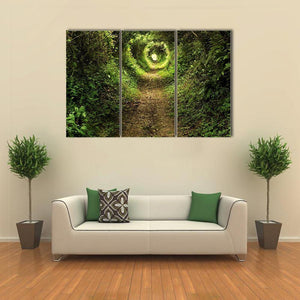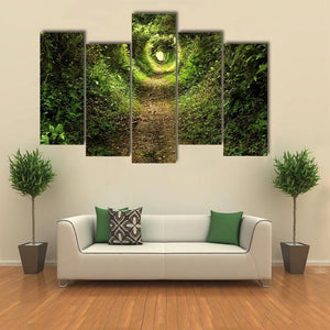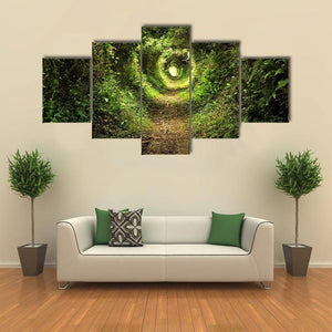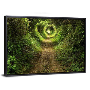 This canvas art portrays a serene forest path, inviting you to explore its enchanting tunnel of trees. With a captivating interplay of sunlight filtering through lush green and brown foliage, it evokes a peaceful, mysterious ambiance.