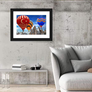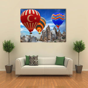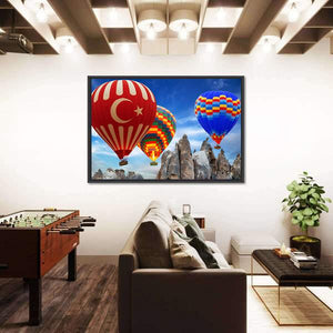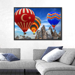 This vibrant canvas art features a hot air balloon adorned with the Turkish flag, soaring above majestic rock formations. The adventurous scene, bathed in a serene mix of colors, brings warmth and excitement to any space.