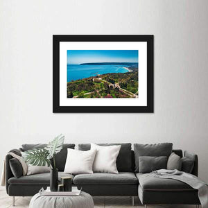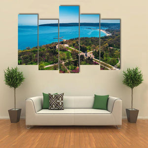 Varna In Spring Time shows an aerial view of a coastline and a lush park beside a calm blue sea. The photorealistic scene reads serene, bright, and expansive with clear sky, green trees, and distant shoreline. It pairs well with modern, nature-focused room decor.