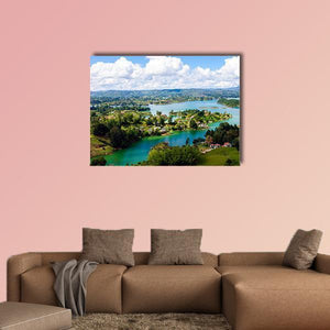 Serene and vibrant, this realistic landscape is an aerial view from the Rock of Guatapé in Colombia showing a turquoise lake, a village, mountains and white fluffy clouds. Diagonal lines and dense green trees draw the eye across the scene. It fits well in a living room or modern home.