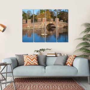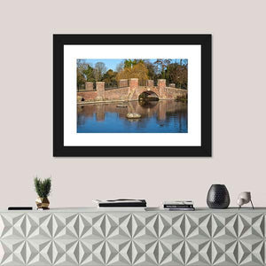 This canvas art features a serene view of an arched brick bridge over a tranquil lake, surrounded by trees and rocks. The peaceful palette of blues and browns evokes a natural atmosphere, making it a lovely addition to any wall decor.