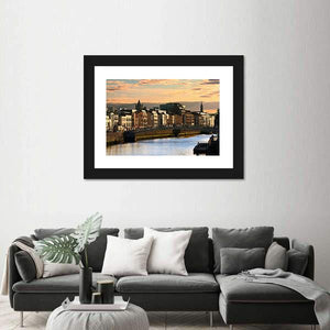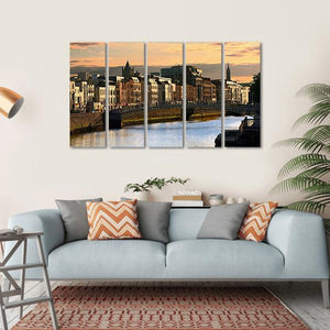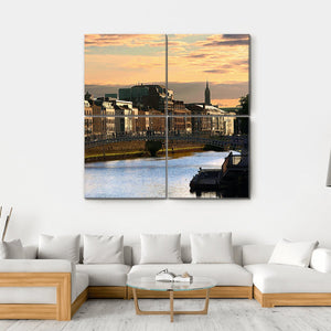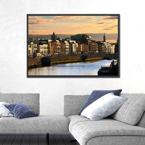 This canvas art captures the tranquil beauty of Dublin's city skyline at sunset, featuring the River Liffey and its iconic arched bridge. With a warm palette of orange, blue, and brown, it brings a scenic and inviting atmosphere to any space.