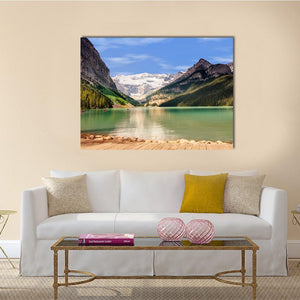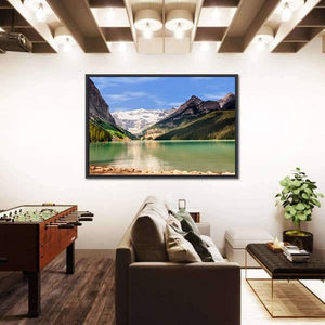 A serene, majestic realistic landscape captures an emerald green lake and snow-capped mountains, with a wooden dock and multiple red canoes in the foreground. The calm color palette of greens, blues, whites and browns suits modern living spaces or nature-inspired rooms.