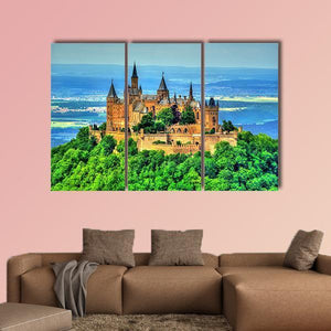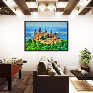 This canvas shows Hohenzollern Castle in Germany from an elevated viewpoint, the spire-topped silhouette rising above a lush green forest under a clear blue sky. Soft greens, browns and blues give the scene a majestic, peaceful mood that suits modern living rooms or entryways.