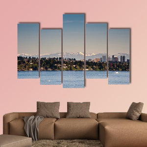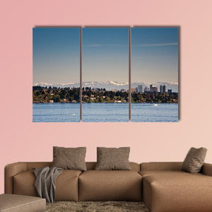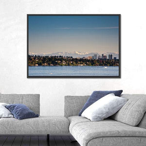 Lake Washington is captured in a photorealistic view that includes a distant city skyline, snow-capped mountains and a tree-lined shore. Soft blue, green, white and grey tones and the calm water surface create a serene, expansive mood that works well in home living spaces and modern room decor.