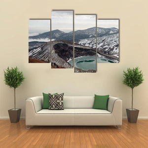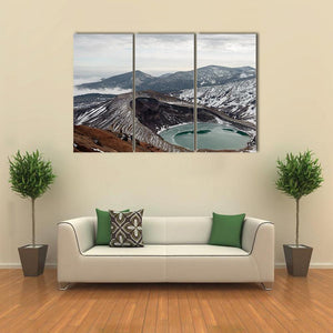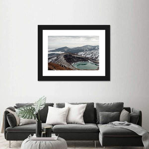 This landscape artwork features a high angle view of Mount Zao, showcasing a volcanic crater lake surrounded by snow-capped mountains. The serene and majestic atmosphere is complemented by a palette of blue, green, and gray, making it a striking addition to your wall decor.