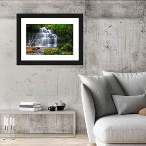 This realistic landscape captures a flowing waterfall set among mossy rocks, lush green foliage and pink flowers in the foreground, conveying a serene, natural mood. The composition uses depth and the rule of thirds to create a tranquil scene. A calm, nature-focused piece that suits modern living rooms or bedrooms.