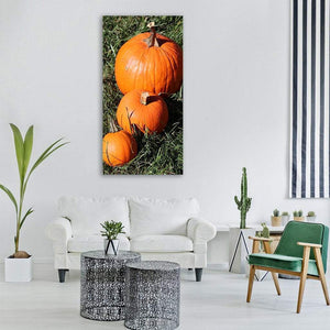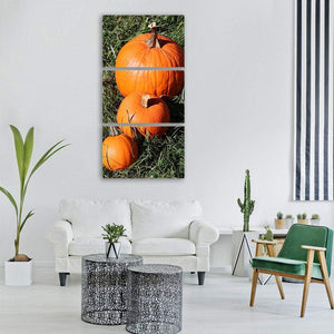 Three Pumpkins on Fall Grass Vertical Canvas Wall Art