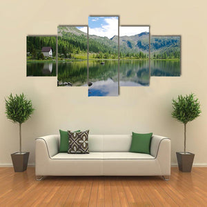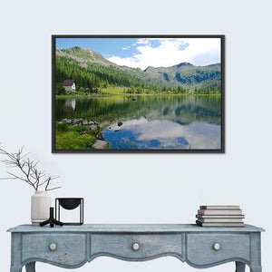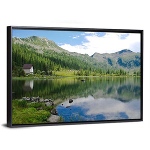 This serene landscape canvas features a tranquil lake surrounded by mountains and a forest, with a charming white house nestled among the trees. The reflection of fluffy clouds in the water adds depth to the peaceful scene, making it an ideal addition to any nature-inspired decor.