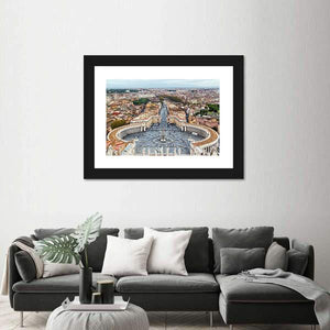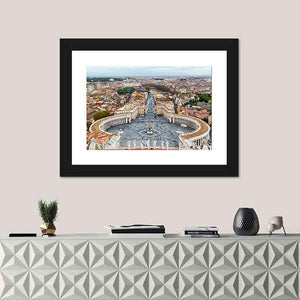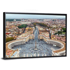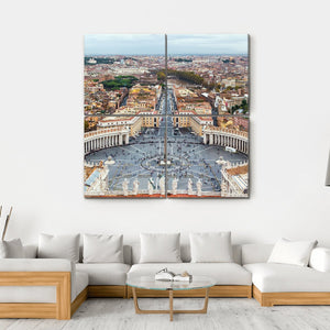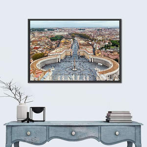 This canvas wall art captures the grandeur of St. Peter's Square in Vatican City, showcasing its historic architecture and symmetry. The warm hues of brown, orange, and grey create a majestic urban atmosphere, perfect for any wall space.