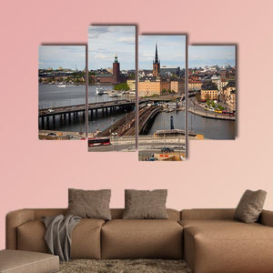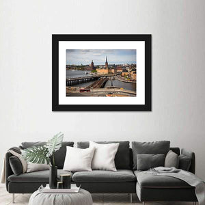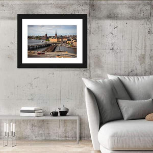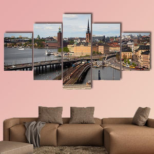 View of Stockholm presents a photorealistic cityscape showing water, bridges and buildings from an elevated wide shot. The daytime, busy scene—accented with blue, brown, orange and grey tones and a red bus, train tracks, a church steeple and tall tower—feels urban and lived-in. It suits modern interiors and city-inspired room decor.