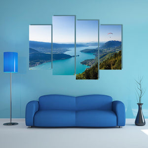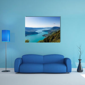 This canvas art captures a serene high-angle view of Annecy Lake, framed by tree-covered mountains and a vibrant sky. With a peaceful palette of blue and green, it brings a touch of nature's beauty into your space.