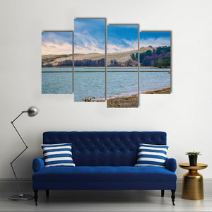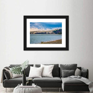 This canvas features a serene winter landscape highlighting the tranquil lake, gently rolling hills, and a cozy foreboding sky. The calming palette of blues, greens, and whites makes it an ideal addition to modern or nature-inspired décor.
