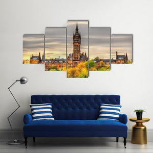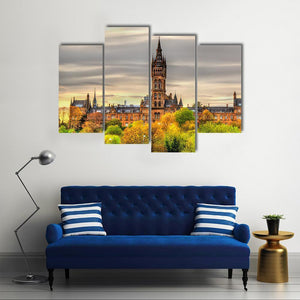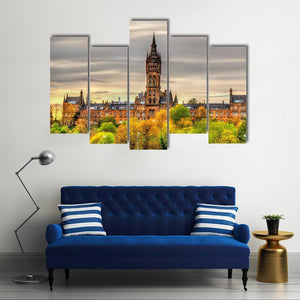 This landscape canvas features the iconic University of Glasgow, surrounded by trees and an autumn sky, creating a warm and inviting atmosphere. Its photorealistic style and rich palette of orange, green, brown, and gray capture the essence of fall, making it a perfect focal point in any room.