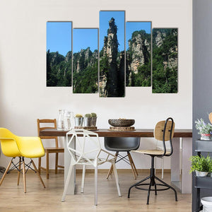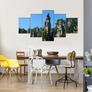 This canvas art captures the serene view of Tianzishan Mountain, showcasing towering rock spires framed by lush green forests against a bright blue sky. Its majestic and natural vibe makes it an ideal addition to any wall decor.