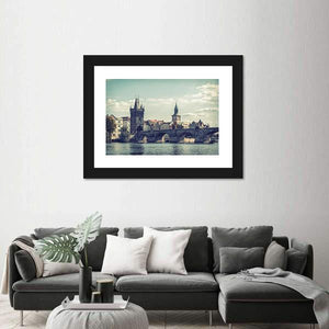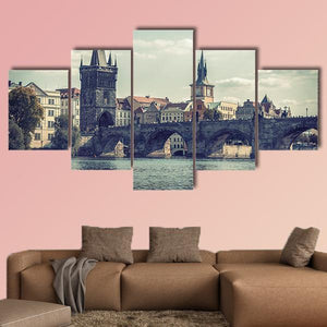 View On Charles Bridge In Prague shows the historic bridge, river and surrounding towers in a wide, eye-level cityscape. The vintage blue, brown and grey palette gives the scene a calm, scenic mood—suitable for modern and vintage interiors seeking a travel or historic accent.