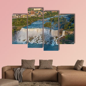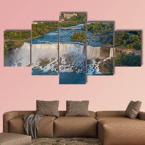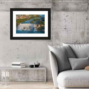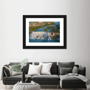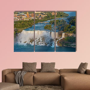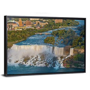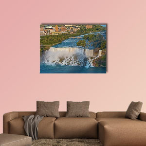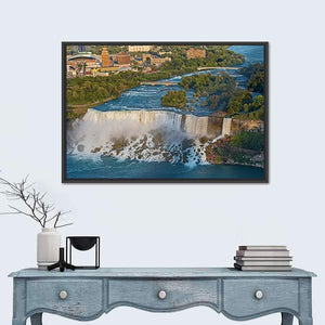 This canvas features Niagara Falls from an aerial mid-shot, showing the waterfall, river, trees, and urban sprawl in the distance. Rendered in a realistic style with blues, greens, browns, and white, it conveys a serene, vast, natural mood and fits modern home decor.