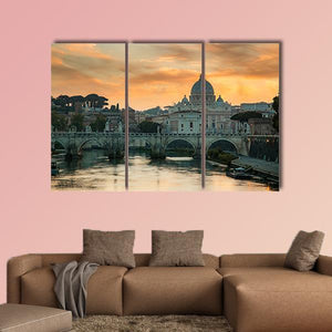 This photographic cityscape captures St. Peter's Basilica and an arched bridge over the river at sunset. Warm orange, brown, grey, and blue tones give the scene a serene, majestic atmosphere. It suits modern interiors and urban-inspired rooms as a calm focal piece.