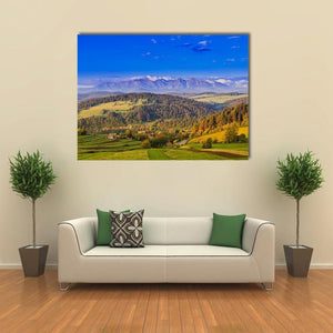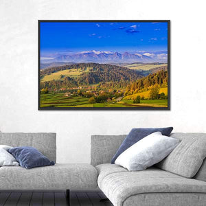 Views Of Pieniny Mountains depicts layered mountain peaks, a valley with scattered village buildings and wooded hillsides in blue, green, white and brown tones. The daytime scene feels peaceful, with snow-capped summits and lush fields. It suits modern room decor and home interiors that favor nature-focused wall art.